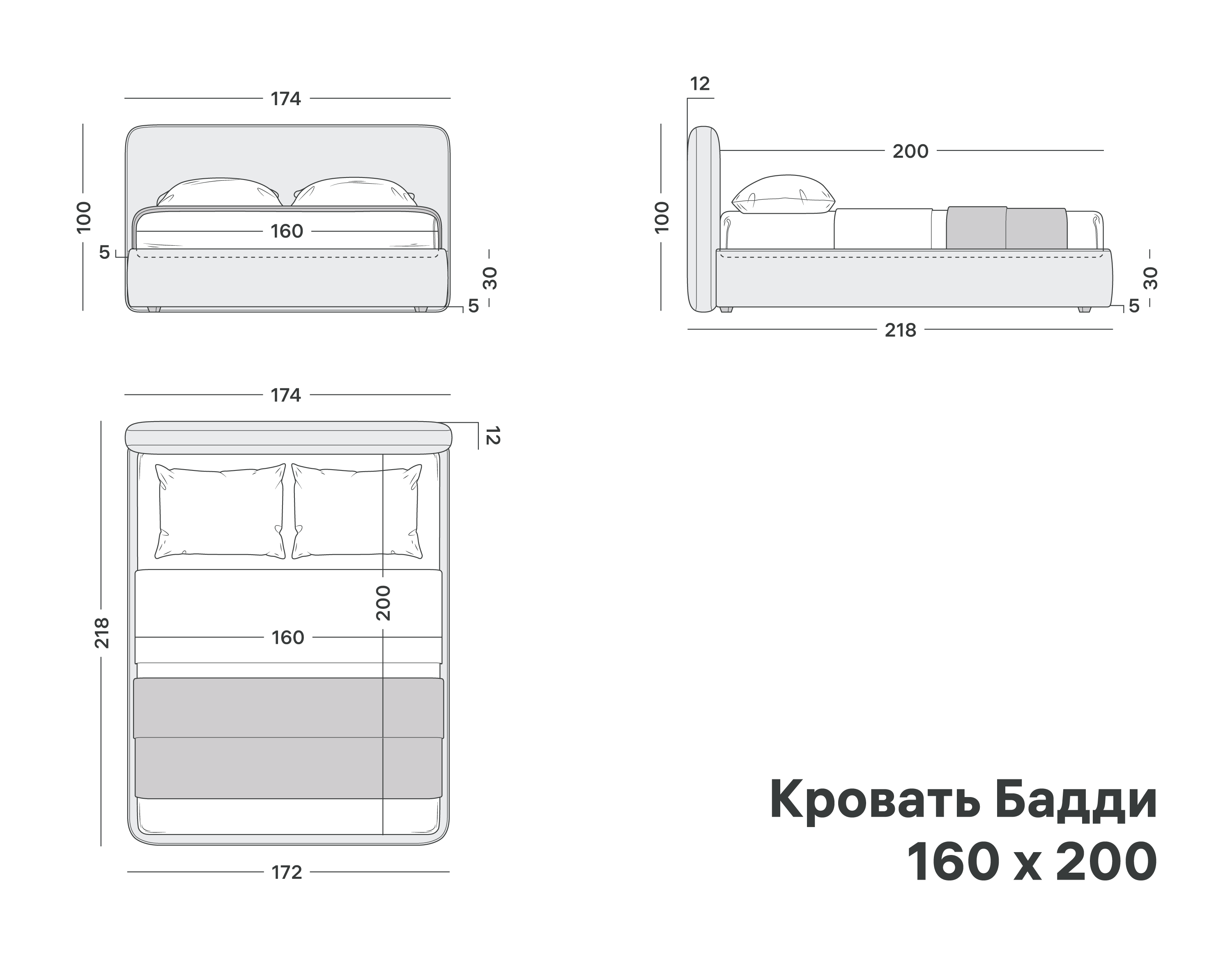 Каркас изголовья и спального места из березовой фанеры марки ФК. Усиленная крепежная обвязка на болтовом соединении. Пенополиуретан различной степени плотности, синтепон, периотек.