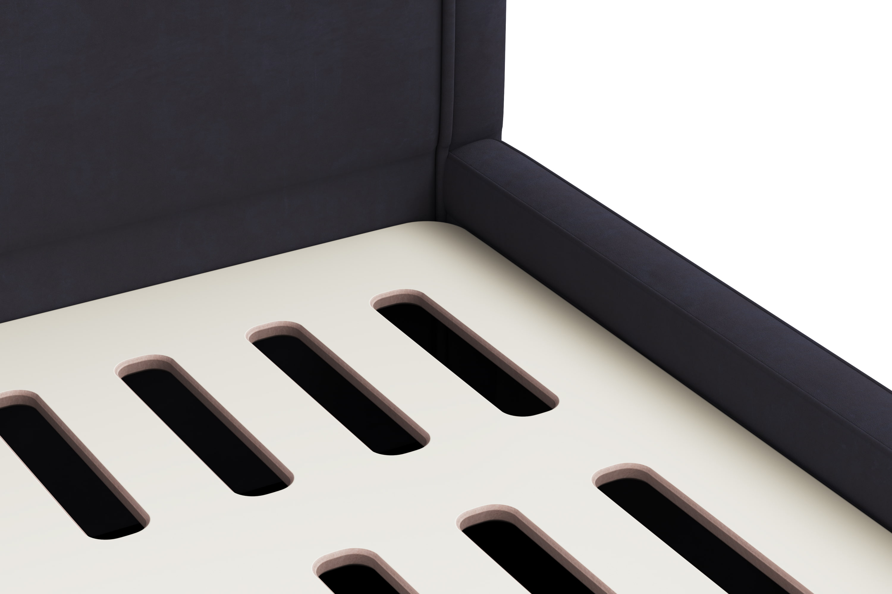 Каркас изголовья и спального места из березовой фанеры марки ФК. Усиленная крепежная обвязка на болтовом соединении. Пенополиуретан различной степени плотности, синтепон, периотек.